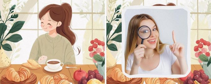 Attēlos redzama simpātiska meitene, kas savā virtuvē bauda brokastis. Viņa dzer kafiju (vai tēju) ar gardiem krāniem. Un desertam viņai ir paredzēti augļi. Attēli izskatās gandrīz identiski, starp tiem ir četras nelielas atšķirības. Vai jums izdosies tās atrast?