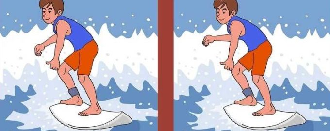 Attēlā redzams sērfotājs puisis, kurš uz sērfa dēļa iekaro viļņus. No pirmā acu uzmetiena var šķist, ka puiši abās bildēs ir vienādi, taču, ja ieskatās tuvāk, kļūst skaidrs, ka tā nav – kaut kur ir dažas atšķirības, kas padara bildes atšķirīgas.