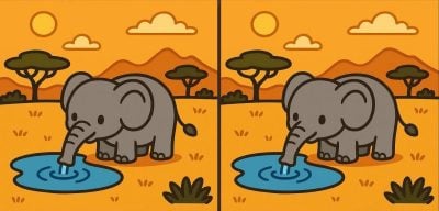 Tātad, vai esat gatavi nākamajam izaicinājumam? Aplūkojiet divus attēlus, kuros zilonis dzer ūdeni. No pirmā acu uzmetiena tie izskatās vienādi, bet paskatieties uzmanīgāk. Attēlā ir trīs nelielas atšķirības. Vai domājat, ka 29 sekunžu laikā varat tās visas atrast? Paskatīsimies, cik jūs esat veikls!