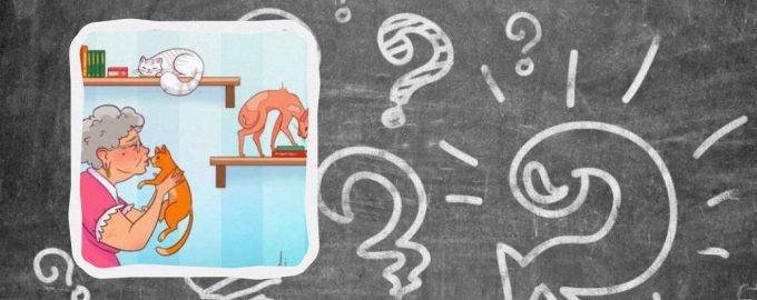 Attēlā redzams pensionārs, kuru ieskauj mājdzīvnieki. Istabā rotaļājas un atpūšas dažādu šķirņu kaķi un kaķenes. Varētu šķist, ka attēlā nav nekā lieka, taču tā nav – mākslinieks šeit ir paslēpis nekonsekvenci.