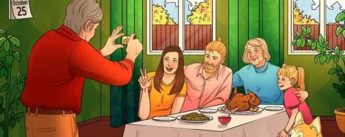 Nākamajā attēlā redzam ģimeni, kas nofotografēta pie Pateicības dienas galda. Par to, ka ģimene svin Pateicības dienu, liecina uz galda novietotais tradicionālais Pateicības dienas tītars.