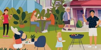 Aplūkojiet zemāk redzamo attēlu. Tajā ir attēlota āra ballītes aina. Attēlā redzamie cilvēki pavada laiku, atpūšoties, sarunājoties un grilējot.