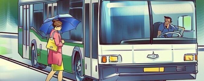 Attēlā redzam sievieti, kas iekāpj autobusā. Ārā ir lietains laiks, tāpēc viņa rokās tur lietussargu, lai pasargātu sevi no nokrišņiem.